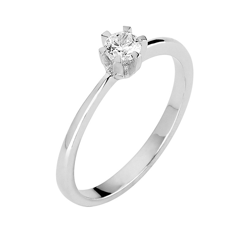 Κλασικό μονόπετρο δαχτυλίδι με διαμάντιμε δέσιμο που αναδεικνύει την λάμψη του απο λευκόχρυσο Κ 18.