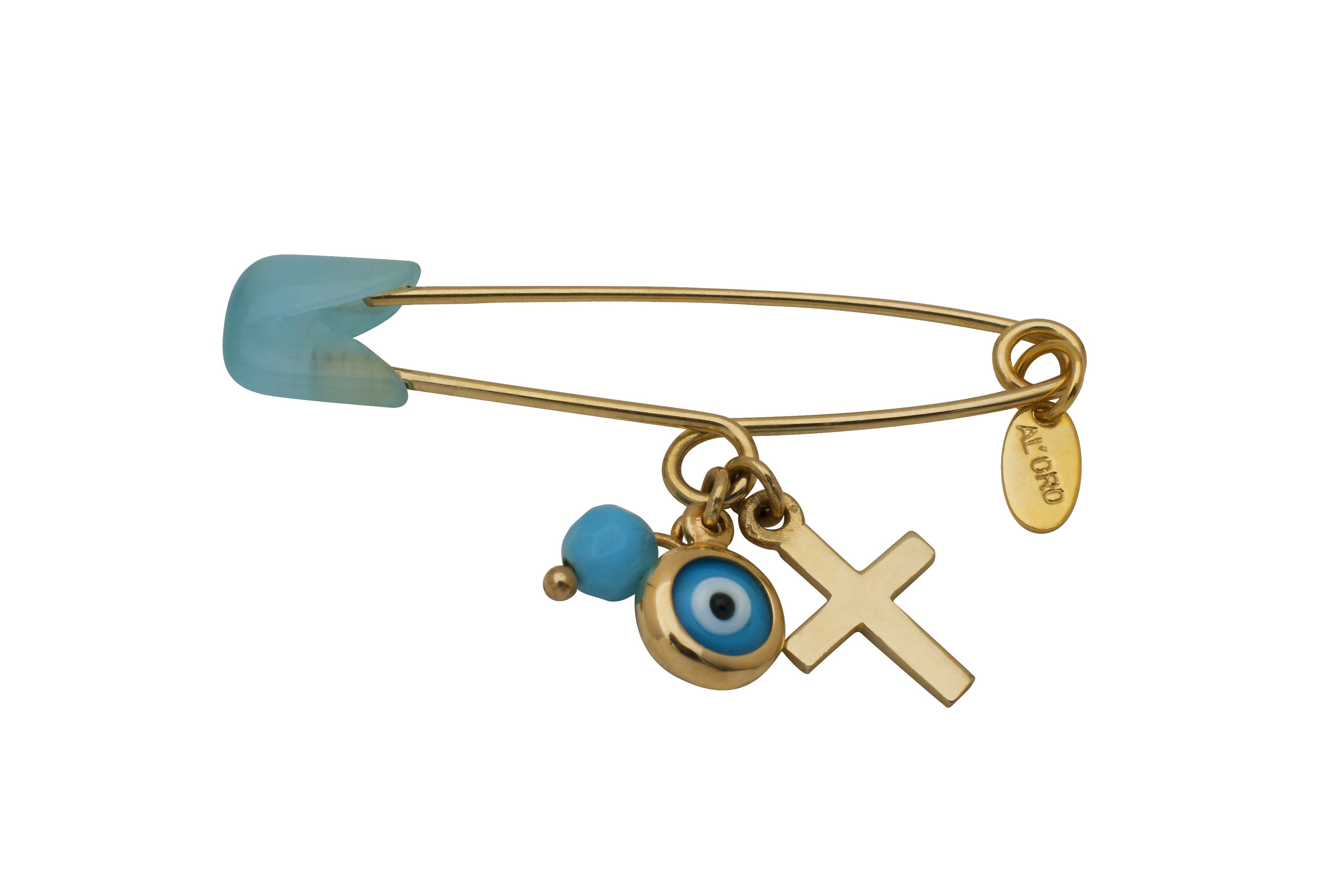 Παραμάνα με σταυρουδάκι, ματάκι και τυρκουάζ χάντραγια κοριτσάκια και αγοράκια από χρυσό Κ 9.