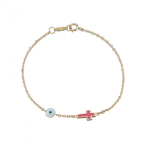 Παιδικό βραχιόλι για κοριτσάκια με σχέδιο σταυρό με ροζ σμάλτο και ματάκι απο χρυσό Κ9.
