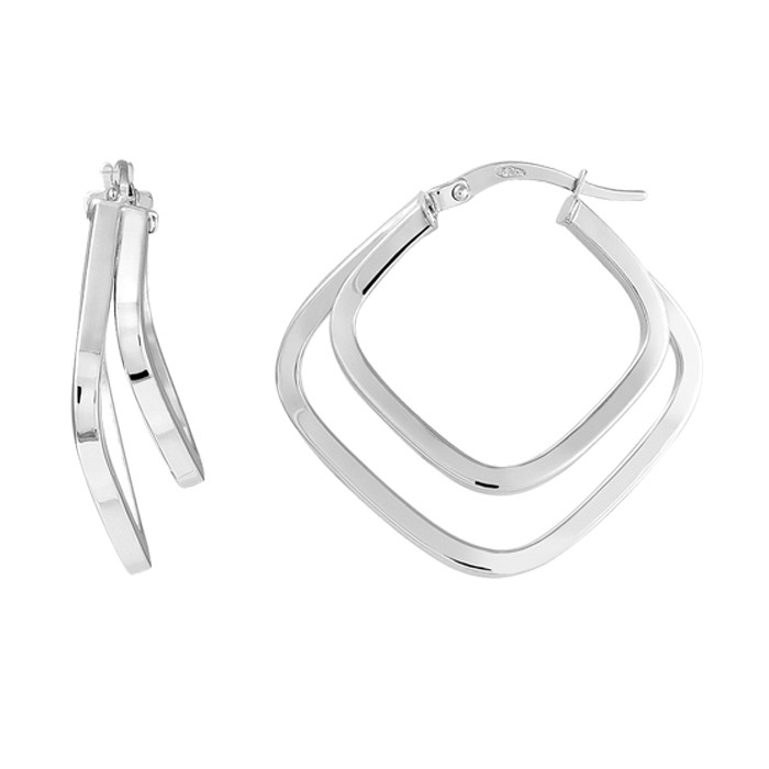 Μοντέρνο και ευκολοφόρετο ζευγάρι σκουλαρίκια με διπλό τετραγωνισμένο κρίκο και κίνηση από λευκόχρυσοΚ 14. Για γυναίκες που θέλουν να ξεχωρίζουν κάθε στιγμή της ημέρας.